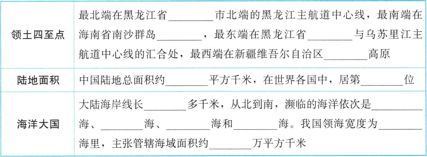 根据湘教版地理八年级上册第一节《中国的疆域》内容,领土四至点:最北端在黑龙江省漠河市北端的黑龙江主航道中心线,最南端在海南省南沙群岛曾母暗沙,最东端在黑龙江省黑龙江与乌苏里江主航道中心线的汇合处,最西端在新疆维吾尔自治区帕米尔高原。陆地面积:中国陆地总面积约960万平方千米,居世界第三位。海洋大国:大陆海岸线长18000多千米,从北到南濒临的海洋依次是渤海、黄海、东海和南海,领海宽度为12海里,主张管辖海域面积约300万平方千米。