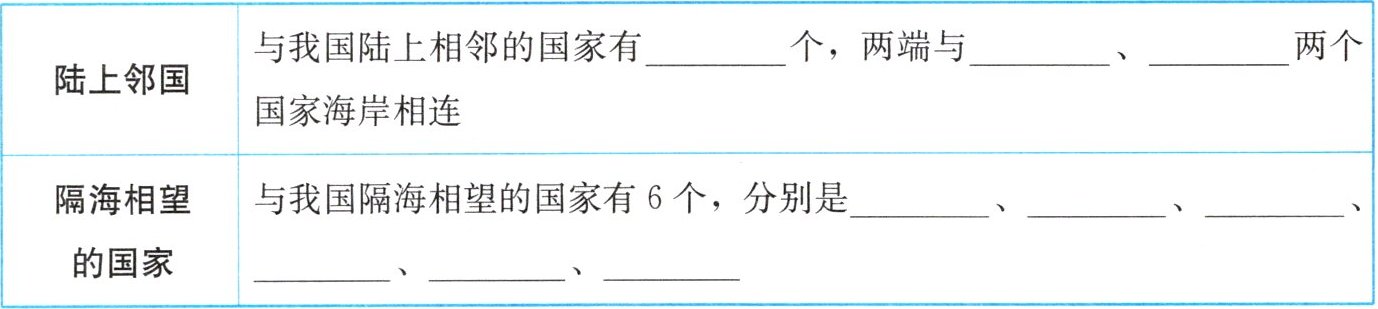 根据湘教版地理八年级上册第一节内容,我国陆上邻国数量为14个,其中朝鲜和越南与我国海岸相连;隔海相望的6个国家依次是韩国、日本、菲律宾、马来西亚、文莱、印度尼西亚。