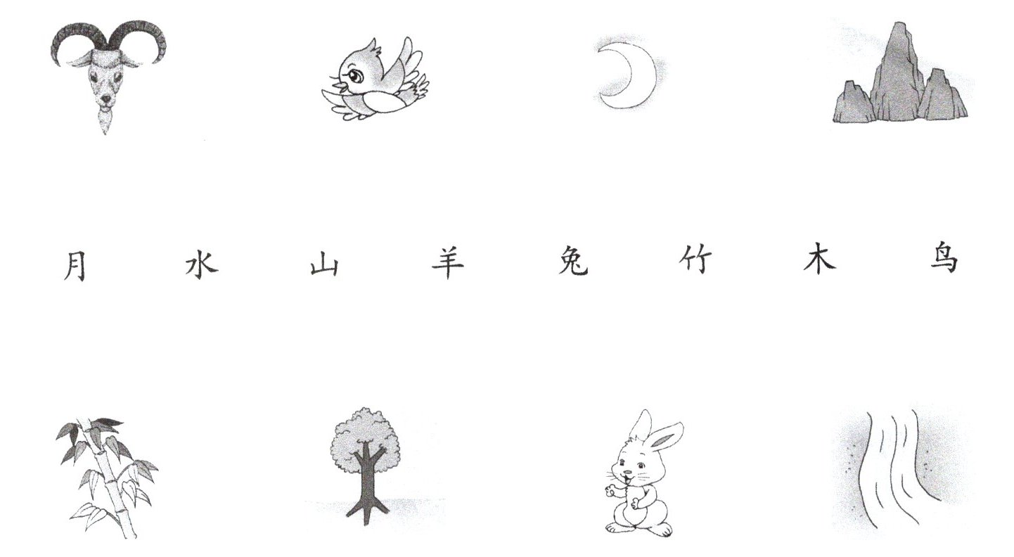 羊头—羊;鸟—鸟;月牙—月;山—山;竹—竹;树(图中对应树的概念,通常和“木”相关联,这里连“木” )—木;兔—兔;水(图中波浪代表水 )—水