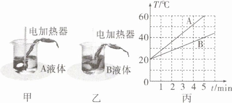 (4)根据实验测得的数据分别描绘出了A、B两种液体的温度随加热时间变化的图像,如图丙所示。分析图像可知:A、B两种液体在吸收相同热量时,
