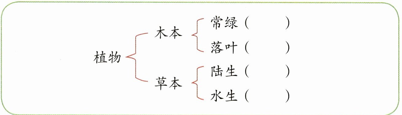 $\begin{cases} 木本 & \begin{cases} 常绿 & (\quad) \\ 落叶 & (\quad) \end{cases} \\ 草本 & \begin{cases} 陆生 & (\quad) \\ 水生 & (\quad) \end{cases} \end{cases}$