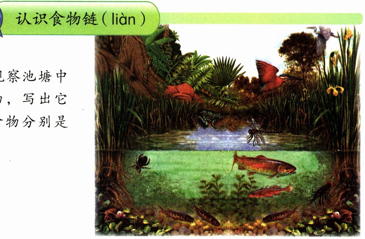 观察池塘生物,水草是生产者,通常被小鱼等初级消费者吃;小鱼会被更高级的消费者如大鱼吃。食物关系按吃与被吃顺序排列。自然界其他食物链需包含生产者、初级消费者和次级消费者。