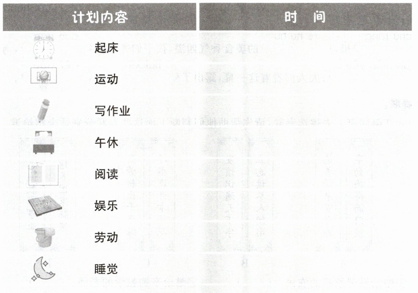 根据日常合理作息安排填写时间,如起床7:00、运动7:30-8:30、写作业9:00-11:00、午休13:00-14:00、阅读14:30-15:30、娱乐16:00-17:00、劳动17:30-18:00、睡觉21:00。