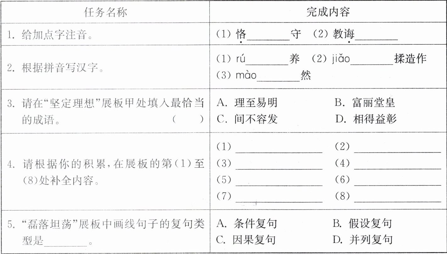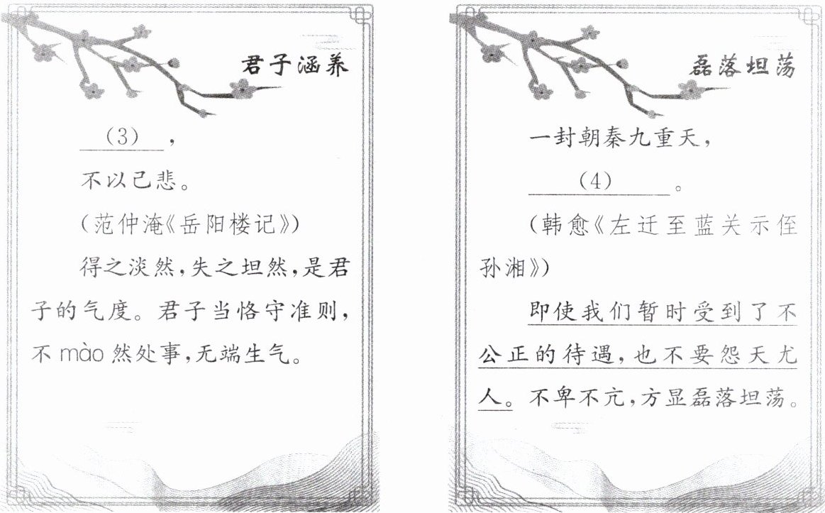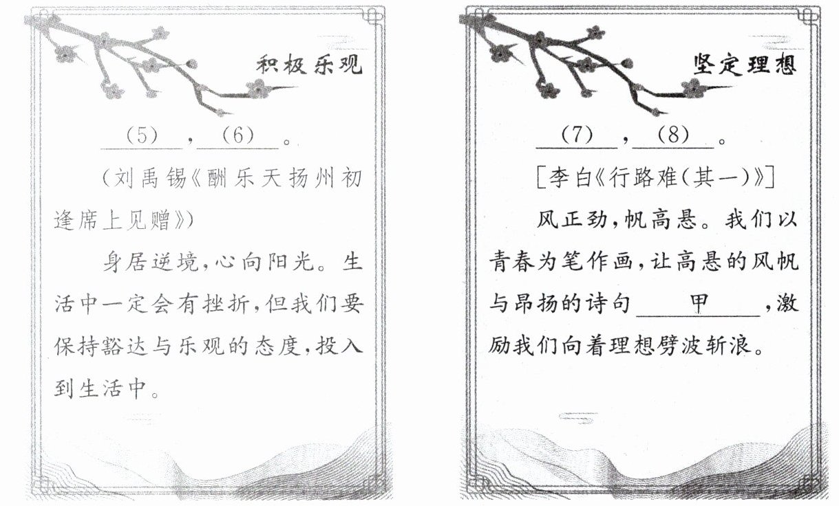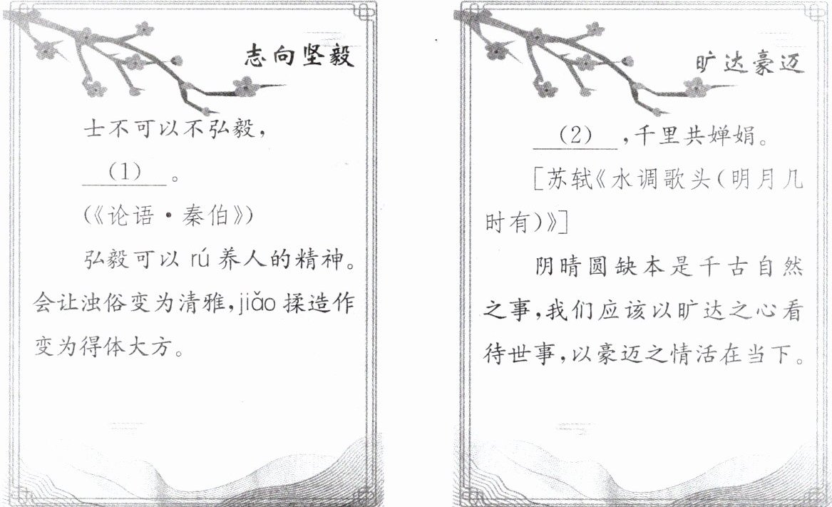 答案:1.(1)kè (2)huì 2.(1)濡 (2)矫 (3)贸 3.D 4.(1)任重而道远 (2)但愿人长久 (3)不以物喜 (4)夕贬潮州路八千 (5)沉舟侧畔千帆过 (6)病树前头万木春 (7)长风破浪会有时 (8)直挂云帆济沧海 5.B
