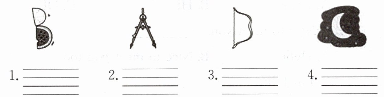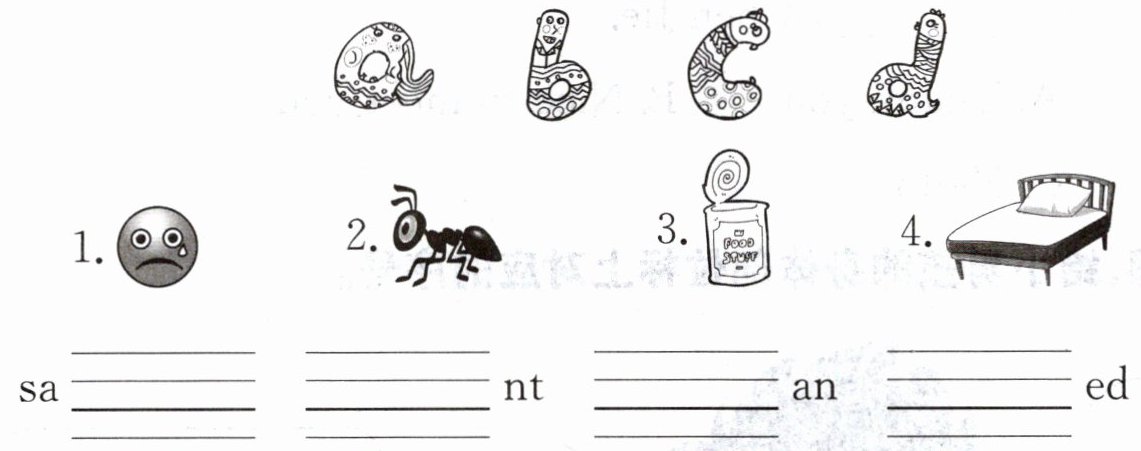 1. 图1为悲伤的表情,单词“sad”意为悲伤的,缺少字母“d”。2. 图2为蚂蚁,单词“ant”意为蚂蚁,缺少字母“a”。3. 图3为罐头,单词“can”意为罐头,缺少字母“c”。4. 图4为床,单词“bed”意为床,缺少字母“b”。