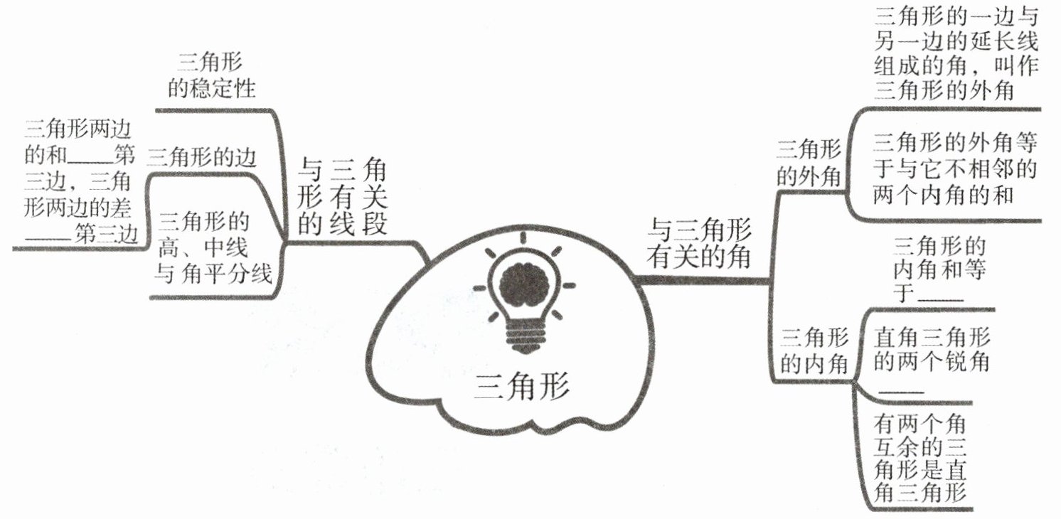 三角形两边的和大于第三边,两边的差小于第三边;三角形内角和为180°;直角三角形两锐角互余。
