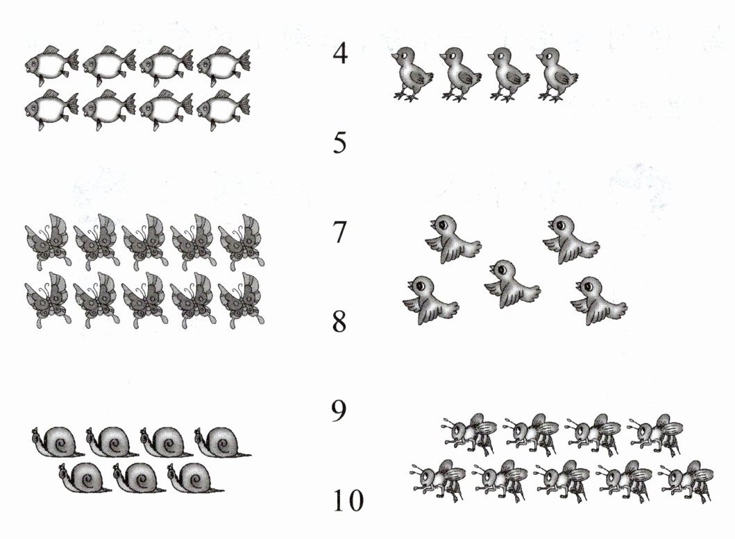 先数出左边各图中物体的数量,鱼有8条,蝴蝶有10只,蜗牛有7只;右边各图中物体的数量,小鸡有4只,小鸟有5只,蜜蜂有9只。再将数量相同的连起来:鱼(8)连8,蝴蝶(10)连10,蜗牛(7)连7,小鸡(4)连4,小鸟(5)连5,蜜蜂(9)连9。