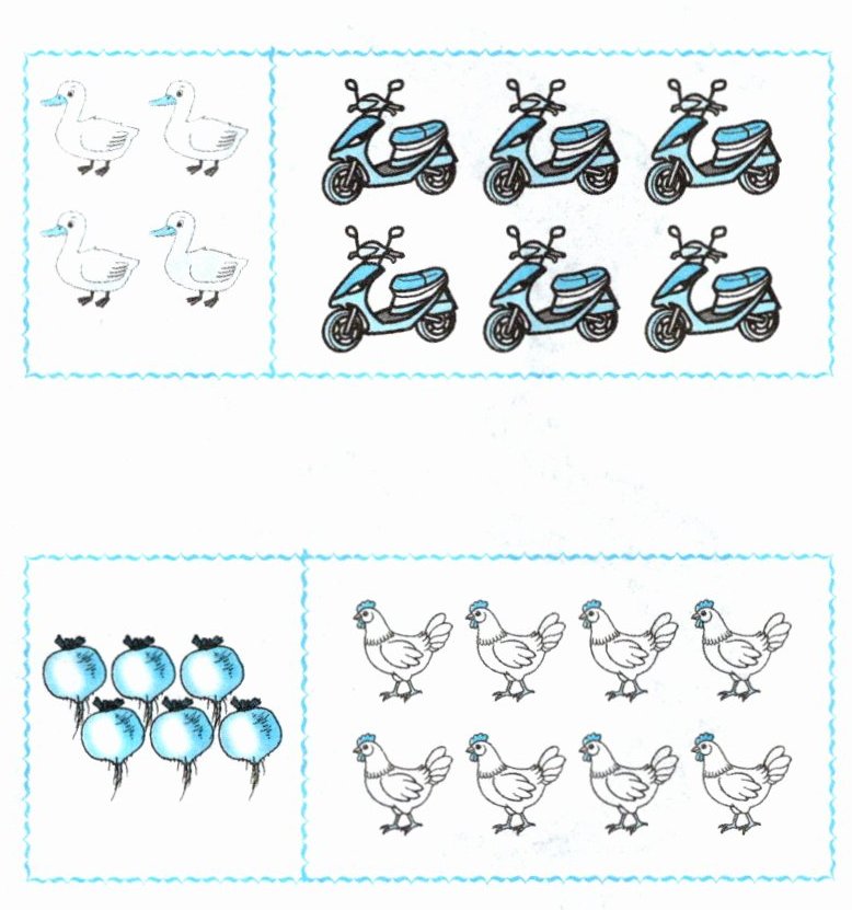先数左边物体的数量,第一组左边有4只鸭子,右边摩托车有6辆,圈出4辆;第二组左边有6个气球,右边小鸡有8只,圈出6只。