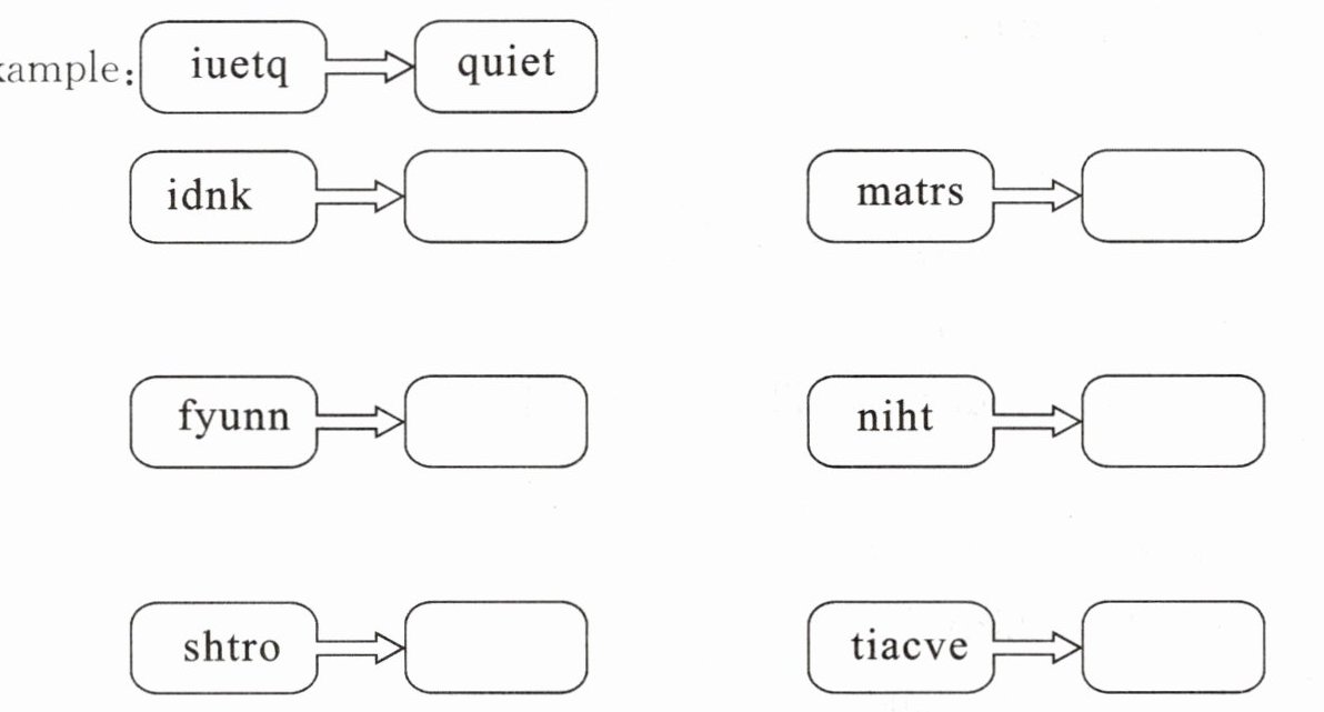 本题是根据给出的乱序字母组合,将其重新排列组成正确的英语单词,可根据所给示例及常见单词的拼写来判断。