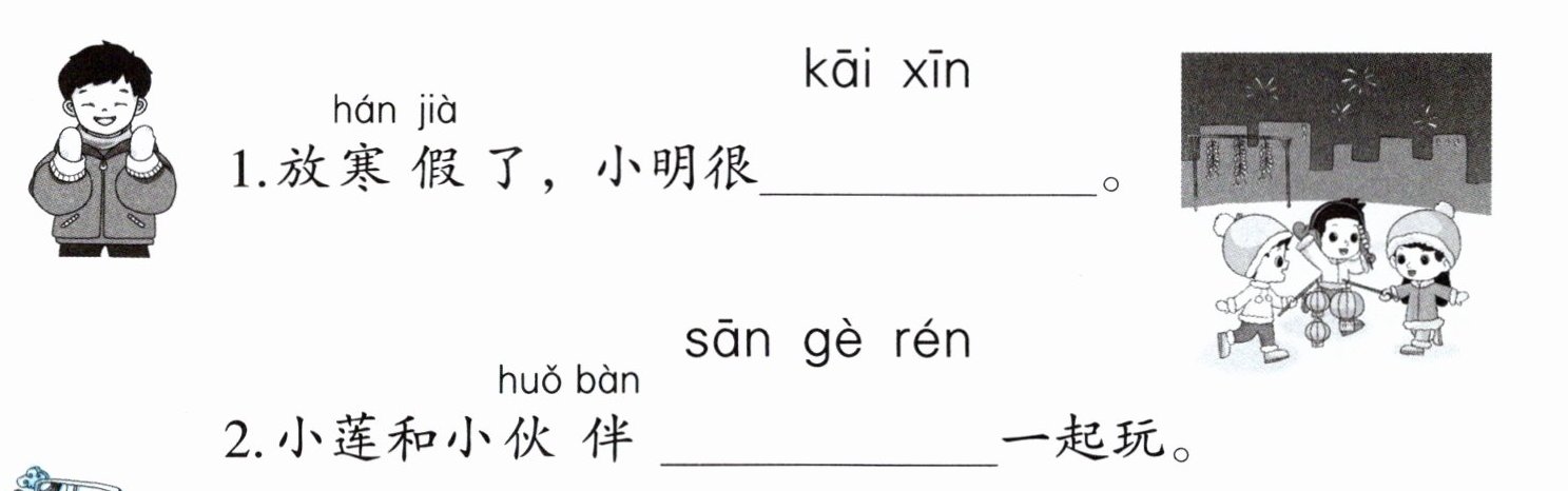 1. 观察插图1,小明面带笑容,结合“放寒假了”的情境及提示“kāi xīn”,应填“开心”。2. 观察插图2,有三个小朋友,结合提示“sān gè rén”,应填“三个人”。