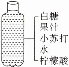 项目学习小组的同学在课堂上与老师一起进行了制作汽水的实验。在约 500 mL 的饮料瓶中加入 2 勺白糖、适量果汁,加入约 1.5 g 小苏打,注入凉开水,再加入约 1.5 g 柠檬酸,盖紧瓶盖,摇匀。据此回答 4~5 题。