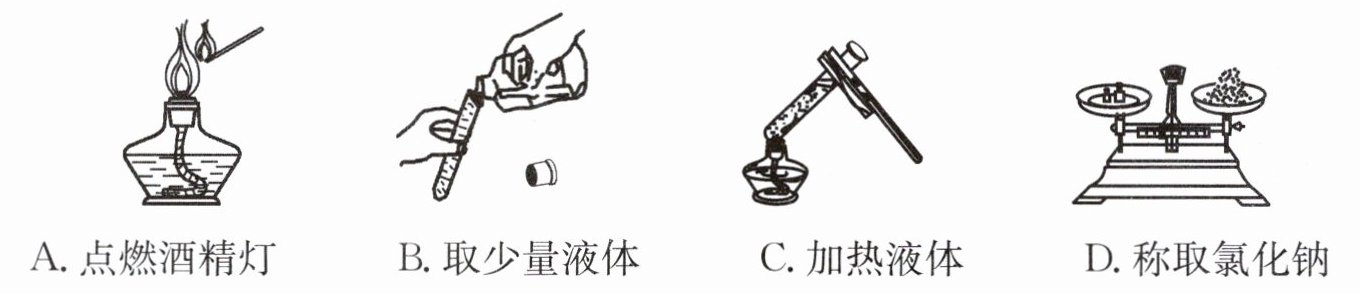 A.不能用燃着的酒精灯去引燃另一只酒精灯,A错误;B.取用液体时,瓶塞应倒放,B错误;C.加热液体时,试管内液体体积不超过试管容积的1/3,用外焰加热,试管夹夹在距试管口1/3处,C正确;D.托盘天平称量时应左物右码,D错误。
