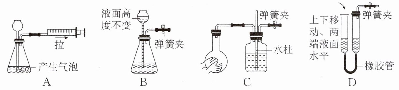 A装置拉动注射器,瓶内气压减小,若气密性良好,长颈漏斗下端会产生气泡,图示“产生气泡”,气密性良好;B装置关闭弹簧夹后,向长颈漏斗加水,若气密性良好,漏斗内液面会保持不变,图示“液面高度不变”,气密性良好;C装置用手捂住烧瓶,瓶内气体受热膨胀,若气密性良好,右侧导管会形成水柱,图示有“水柱”,气密性良好;D装置关闭弹簧夹后上下移动试管,若气密性良好,两端液面应形成高度差,图示“两端液面水平”,说明漏气。
