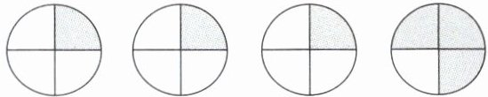 第一个插图中,每个圆被平均分成4份,阴影部分占1份,即每个表示$\frac{1}{4}$,共3个,加法算式为$\frac{1}{4}+\frac{1}{4}+\frac{1}{4}=\frac{3}{4}$,乘法算式为$\frac{1}{4}×3=\frac{3}{4}$。第二个插图中,每个$\frac{2}{9}$对应2个小格,3个$\frac{2}{9}$共6个小格,占整体9格的$\frac{6}{9}=\frac{2}{3}$,加法算式为$\frac{2}{9}+\frac{2}{9}+\frac{2}{9}=\frac{2}{3}$,乘法算式为$\frac{2}{9}×3=\frac{2}{3}$。