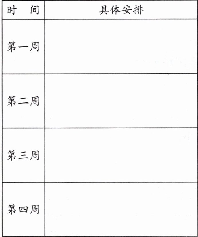 |第三周|复习上学期重点知识,每天运动1小时,学习一项新技能(如画画、折纸)|