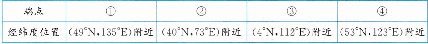 盎然的春色。"读我国疆域四端点地理坐标表,完成 1~3 题。
