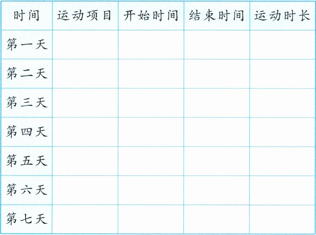 学校每天都安排同学们进行体育锻炼。假期里,让我们也制订一份计划,带着家人一起坚持锻炼吧!