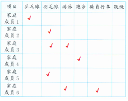 请完成你和家人喜爱的运动项目调查表。(在喜欢的运动项目下面画“√”,每人可以选择 3 项)