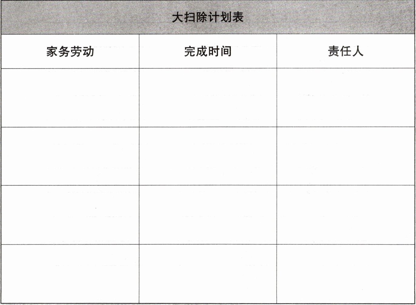请你在家庭会议上与家人讨论迎接新年的大扫除计划,了解各自擅长的家务劳动,并填写大扫除计划表。