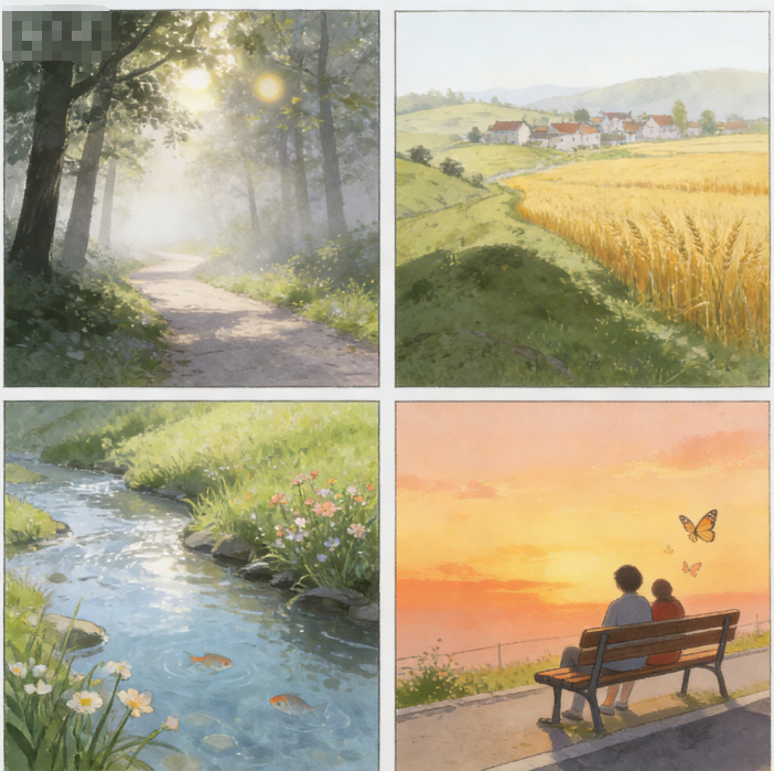 户外步行途中,你发现了哪些美景?请你用四格漫画的形式把沿途看到的美丽的风景展示出来吧!