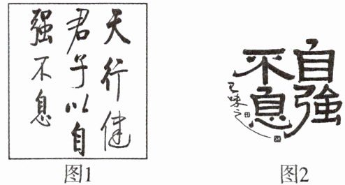答案:我更喜欢图1作品。图1为楷书,字体端庄茂密,浑厚苍劲,内藏筋骨,展现出“自强不息”内在的坚韧与稳重。图2为印章字体,圆拙厚重,粗旷内敛,“自强”“不息”分两行布局,字体大小错落,富有跳跃感,从印章字体古朴风格中可感受到“自强不息”悠久的历史传承与内在凝聚力。但楷书更能体现“自强不息”严谨、持之以恒的内涵。