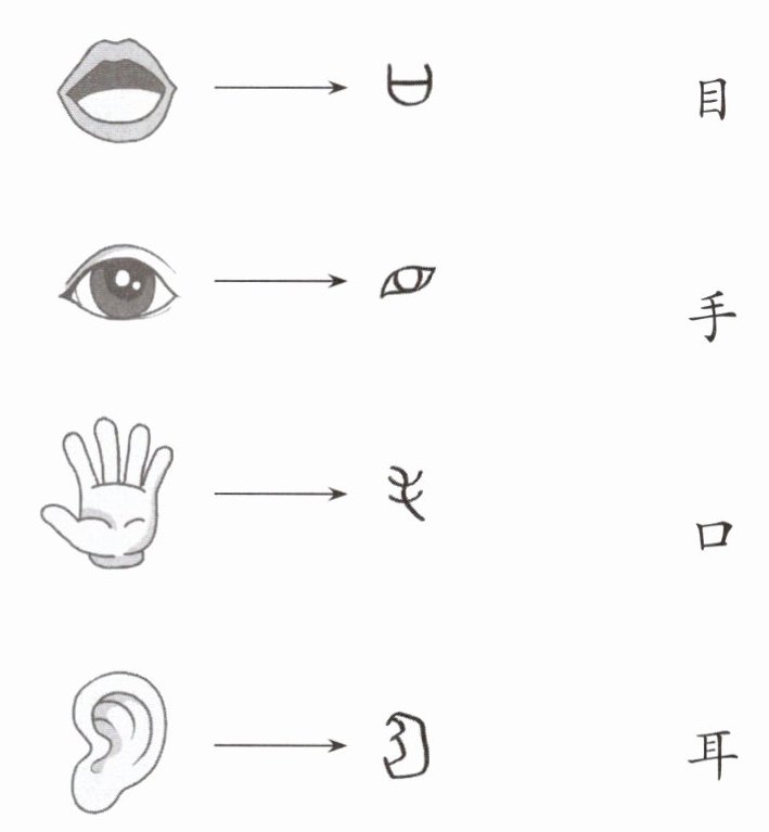 观察插图,第一个图形是张开的嘴,对应“口”;第二个图形是眼睛,对应“目”;第三个图形是手,对应“手”;第四个图形是耳朵,对应“耳”。