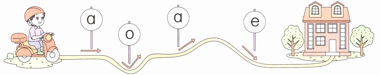观察路线图,第一个字母“a”处箭头水平,标一声平调“ā”;第二个字母“o”处箭头向下,标四声降调“ò”;第三个字母“a”处箭头先降后升,标三声拐弯调“ǎ”;第四个字母“e”处箭头向上,标二声升调“é”。