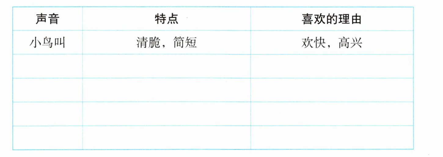本题要求根据听到的声音,填写声音名称、特点以及喜欢的理由,可根据实际听到的声音进行观察记录填写,以下为示例解析。