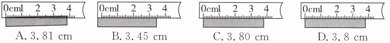 C图:刻度尺的刻度紧贴工件,并且读数为3.80 cm,方法正确。