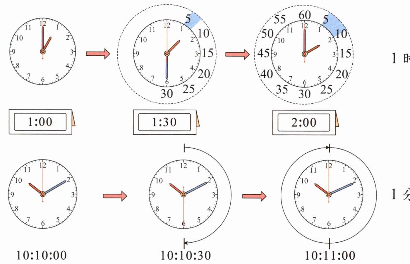第三个钟表显示时间为10:11:00,秒针从6转到12,表示又过了30秒,总共过了1分钟。