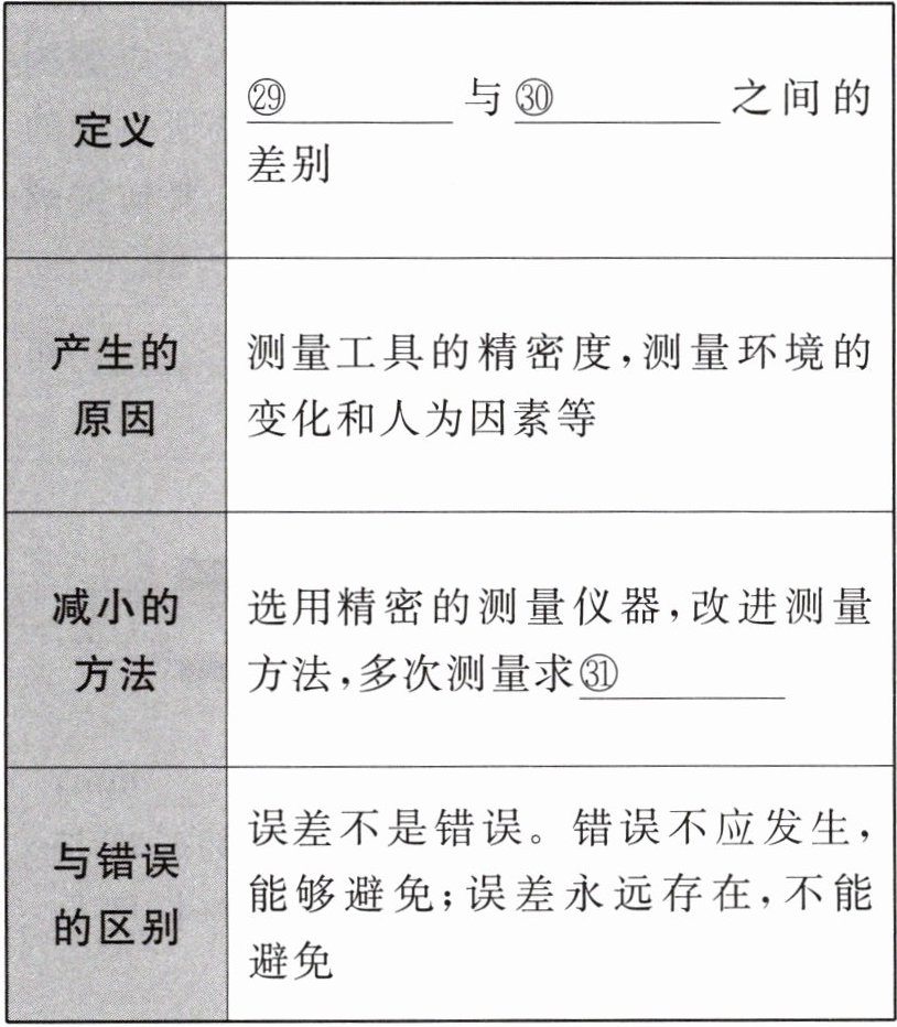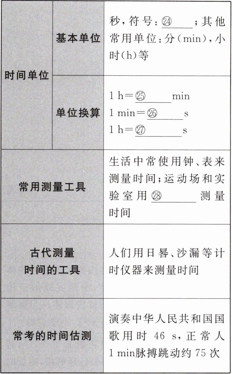 答案:①米 ②m ③1000 ④0.1 ⑤0.01 ⑥0.001 ⑦10⁻⁶ ⑧10⁻⁹ ⑨cm ⑩cm ⑪m ⑫刻度尺 ⑬量程 ⑭分度值 ⑮零刻度线 ⑯刻度线 ⑰分度值 ⑱数字 ⑲单位 ⑳1 ㉑0~10 ㉒4.00 ㉓2.50 ㉔s ㉕60 ㉖60 ㉗3600 ㉘停表 ㉙测量值 ㉚真实值 ㉛平均值