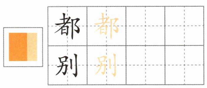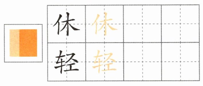 观察插图1中“休”“轻”“都”“别”的结构,“休”“轻”左边窄右边宽,“都”“别”左边宽右边窄,按要求在田字格中规范书写各字两遍。