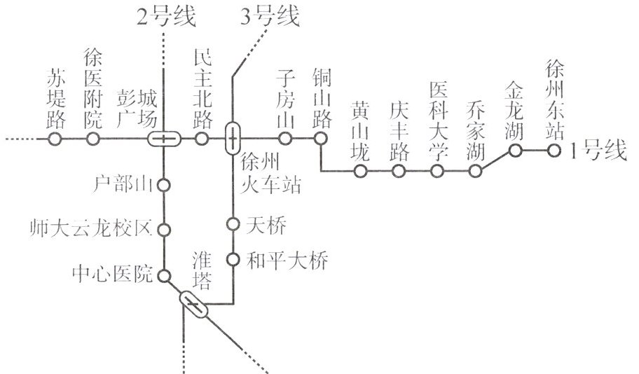 2. 看完资料介绍,小徐同学准备在“徐州东站”站上车,乘坐地铁前往“淮塔”站,请你帮他规划一条合适的路线。