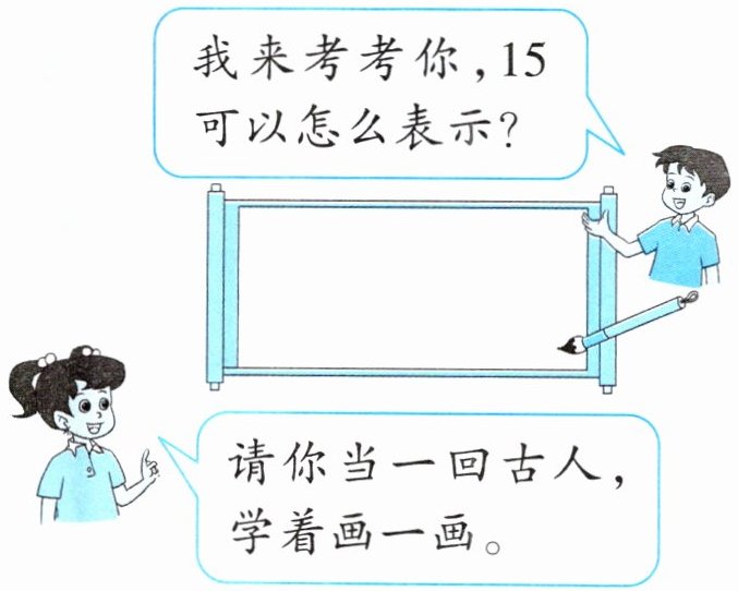 古人用图形表示13,由1个类似“拱门”的图形和3根竖线组成。13是由1个十和3个一组成,所以“拱门”表示10,竖线表示1。15由1个十和5个一组成,应画1个“拱门”和5根竖线。