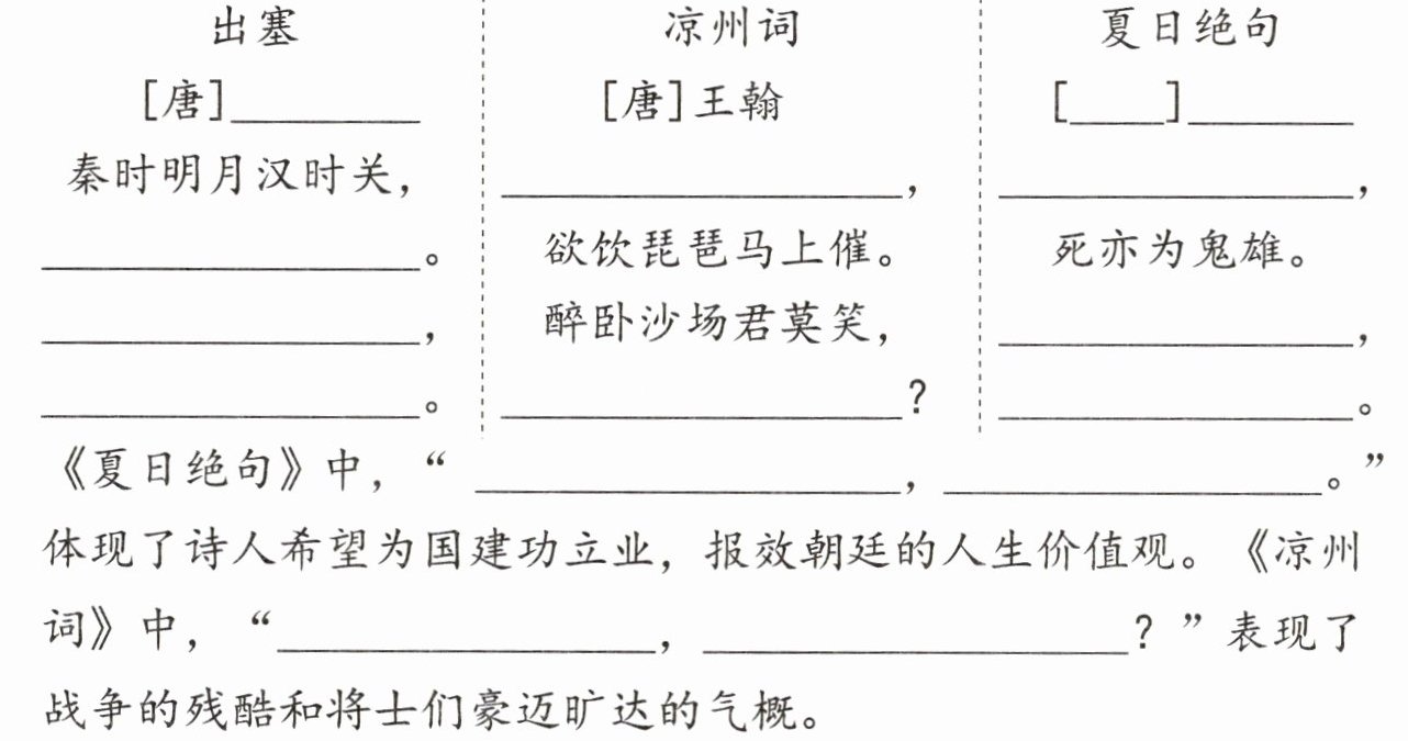 《凉州词》中表现了战争的残酷和将士们豪迈旷达的气概的诗句是:醉卧沙场君莫笑,古来征战几人回?