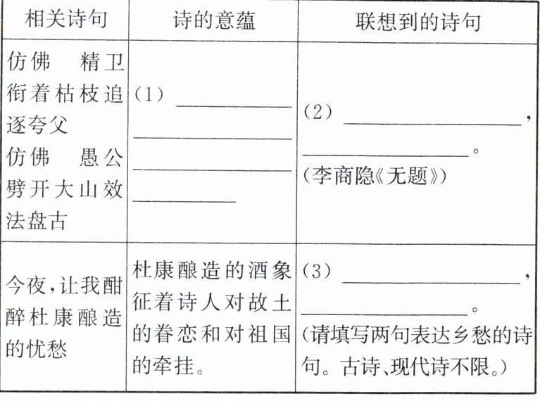 2. 有人说:“诗的内在和谐是通过联想来传达的。”看到以上某些诗句,你感受到诗歌怎样的意蕴?联想到了其他哪些诗句?请根据你的感受,填写下面表格。