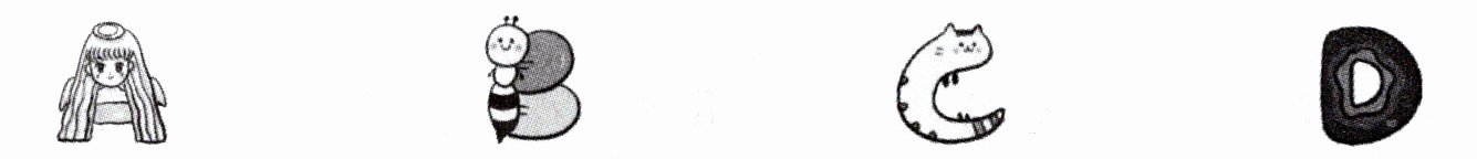 观察图片,第一个图片是女孩形象,通常对应字母A;第二个图片是蜜蜂形状像字母B;第三个图片是猫的形状像字母C;第四个图片是洞的形状像字母D。根据三年级所学字母知识,写出对应的大小写。