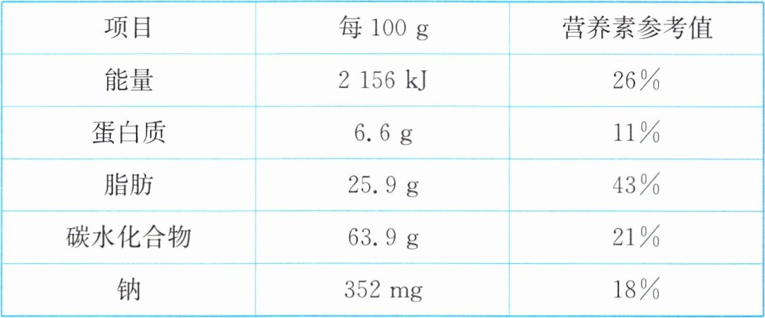 。参考上表,每 100 g 饼干中脂肪占到人体一天总需求量的