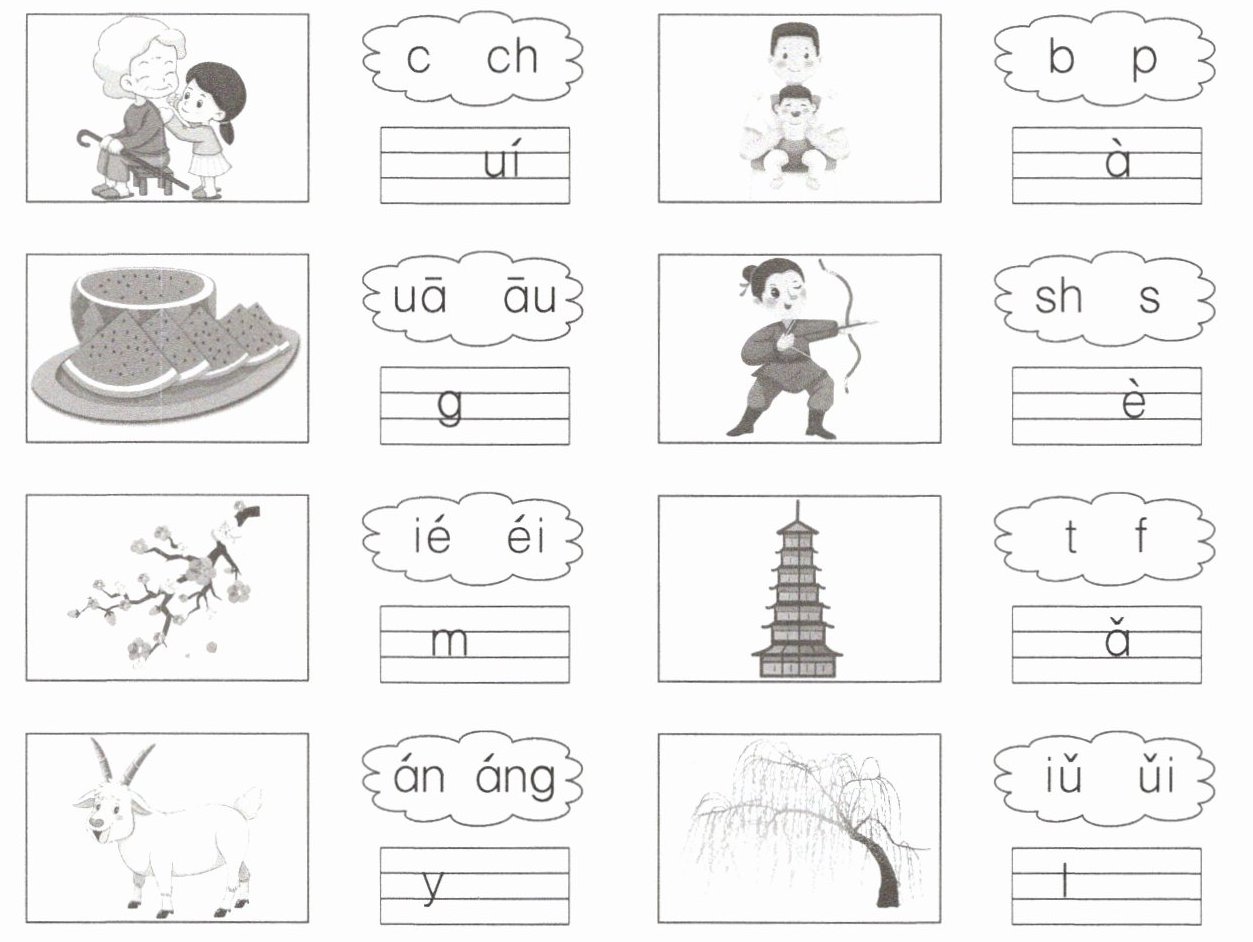 观察插图1,第一幅图是小女孩给奶奶捶背,“捶背”的“捶”音节是chuí,所以填ch;第二幅图是两个小孩,“爸爸”的“爸”音节是bà,所以填b;第三幅图是西瓜,“瓜”音节是guā,所以填uā;第四幅图是射箭,“射”音节是shè,所以填sh;第五幅图是梅花,“梅”音节是méi,所以填éi;第六幅图是塔,“塔”音节是tǎ,所以填t;第七幅图是山羊,“羊”音节是yáng,所以填áng;第八幅图是柳树,“柳”音节是liǔ,所以填iǔ。