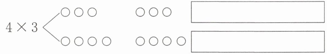 答案:左側第一组图形:$4 × 3$ 的结果再分成了两组,一组是3个圆圈,另一组是4个圆圈。