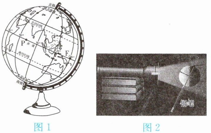 4. 图2中的铅笔穿过地球仪的南北两个极点,类似于地球仪的地轴,因此表示的是地轴。