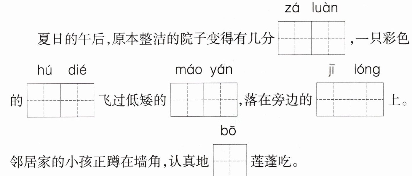 答案:杂乱;蝴蝶;茅檐;鸡笼;剥