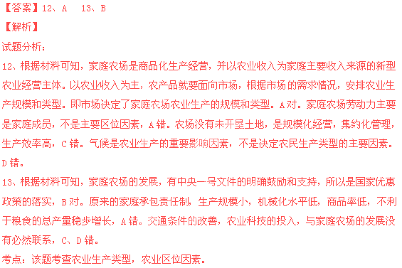 家庭农场是指以家庭为主要劳动力,从事农业规模化、集约化、商品化生产经营,并以农业收入为家庭主要收入来源的新型农业经营主体。目前家庭农场已经在我国一些地方涌现。2013年中央一号文件首次鼓励和支持承包土地向专业大户、家庭农场、农民合作社流转。据此,完成12~13题。