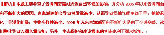 2.据青海省气象部门监测,青海湖面积自2005年以来持续增大,2011年达到近11年来的最大值。而2004年之前的近30年,由于气候变化和人类活动的影响,青海湖面积曾不断萎缩。运用地理环境整体性的原理,简述2004年前青海湖湖面萎缩对周边自然地理环境的影响。(3分)