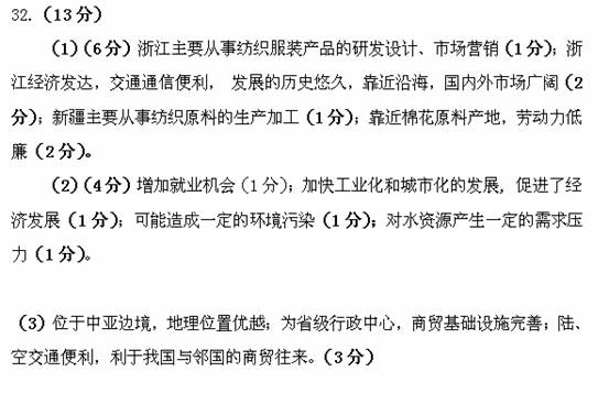 (1)从产品生产成本角度,说出新疆承接浙江纺织服装生产加工企业的有利条件。(4分)