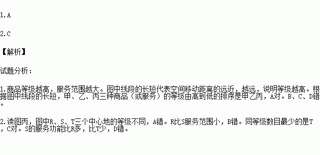 2.关于丙图中R、S、T三个中心地的说法正确的是