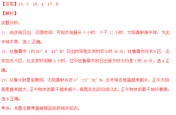 某报登载一则消息说“今日,吐鲁番市(约90°E 43°N)日出时间是北京时间9时30分,而日落时北京时间是18时30分。”根据这则消息,判断15~16题: