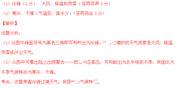 (2)概述图示季节我国北方地区的气候特征。(2分)