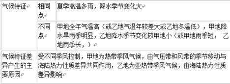 (1)填表比较甲、乙两地气候特征及其差异的主要原因。(8分)