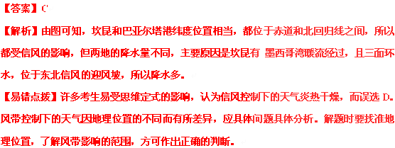 D.坎昆受信风影响降水多